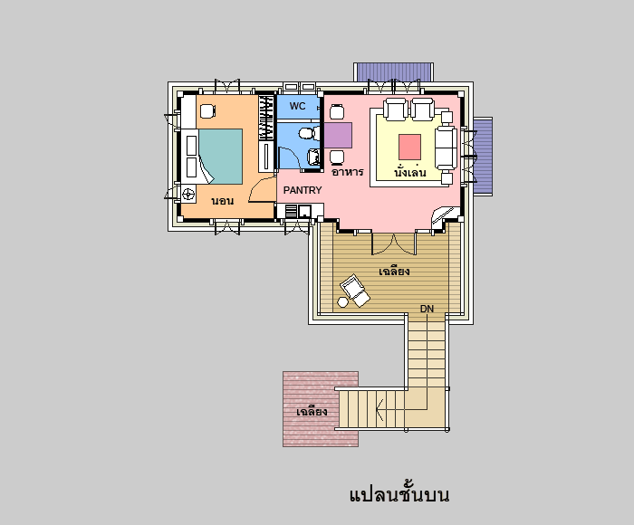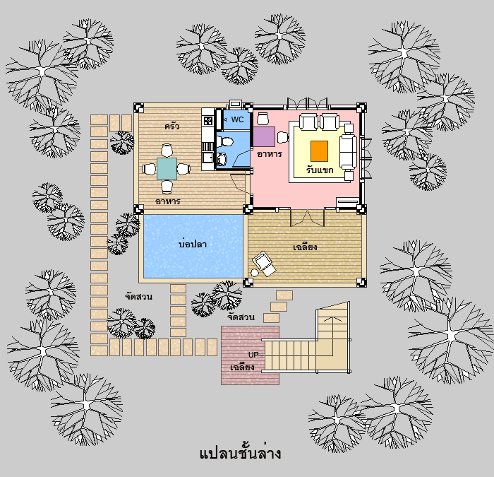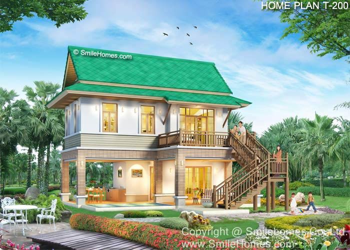 บ้านสไตล์ Modern Thai แบบบ้านอยู่สบาย ใกล้ชิดธรรมชาติ เน้นการประหยัดพลังงาน เป็นบ้าน 2 ชั้น ขนาดเล็ก ใช้เป็นเรือนพักผ่อนในสวน, เรือนริมน้ำ, เรือนรับรอง หรือทำเป็น Resort สำหรับให้เช่าได้ มี 1 ห้องนอน 2 ห้องน้ำ รูปทรงภายนอกสวยงาม สไตล์ไทยประยุกต์ เน้นทางเข้าบ้าน ด้วยบันไดทางขึ้นบ้าน ชั้นล่างเป็นเฉลียงนั่งเล่น นอกชานขนาดใหญ่ ภายในเป็น ห้องโถงอเนกประสงค์แบบโปร่งโล่ง ใช้เป็นส่วนรับแขก หรือนั่งเล่น พร้อมส่วนทานอาหาร มีส่วนครัวไทยและส่วนทานอาหารภายนอก พร้อมบ่อเลี้ยงปลา ชั้นบน จากบันไดทางขึ้น จะเป็นเฉลียงนอกชาน มีที่นั่งแบบสบายๆ ภายในเป็นห้องนั่งเล่น พร้อมส่วนอาหารเล็กๆ พร้อม pantry สำหรับเตรียมอาหาร มีห้องนอน 1 ห้อง และห้องน้ำที่มีสุขภัณฑ์ครบชุด ชั้นล่าง ** พื้นที่ใช้สอย 53 ตร.ม. ** ชั้นบน ** พื้นที่ใช้สอย 53 ตร.ม. **