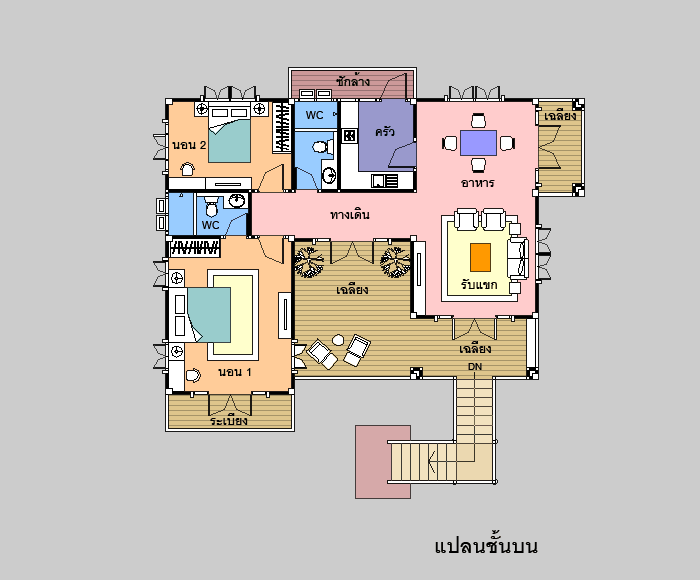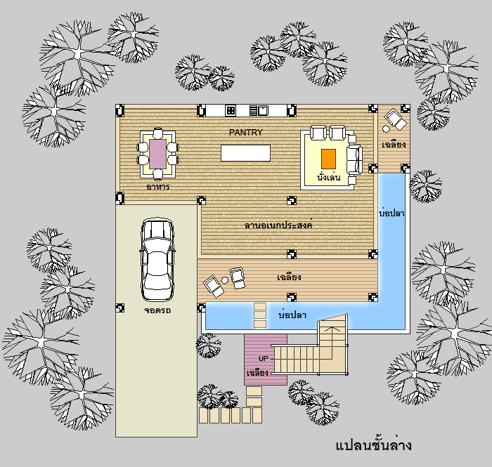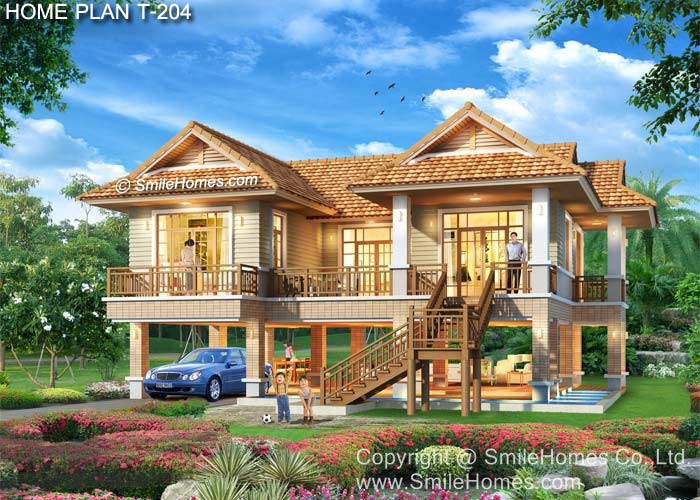 บ้านสไตล์ Modern Thai เป็นแบบบ้านอยู่สบาย ใกล้ชิดธรรมชาติ เน้นการประหยัดพลังงาน เป็นบ้านยกระดับ ใต้ถุนโล่ง สำหรับถ่ายเทอากาศตามธรรมชาติ เป็นบ้าน 2 ชั้น มี 2 ห้องนอน 2 ห้องน้ำ ที่จอดรถ 1 คัน ตัวบ้านรูปทรงภายนอกสวยงาม ทรงไทยประยุกต์ เน้นทางเข้าบ้าน ด้วยบันไดทางขึ้นชั้นบน ชั้นล่างทำเป็นใต้ถุนโล่ง มีเฉลียงนั่งเล่น และลานอเนกประสงค์ขนาดใหญ่ ใช้เเป็นส่วนนั่งเล่น ส่วนทานอาหาร มี Pantry สำหรับเตรียมอาหาร ด้านหน้าและด้านข้างทำเป็นบ่อเลี้ยงปลา ชั้นบนมีเฉลียงนั่งเล่น นอกชานขนาดใหญ่ ภายในมีส่วนรับแขกโปร่งโล่ง ต่อเนื่องกับ ส่วนทานอาหาร ซึ่งมีเฉลียงออกด้านข้างได้ ห้องครัว แยกเป็นสัดส่วน และส่วนซักล้างด้านหลัง มีห้องนอนใหญ่ ที่กว้างขวาง พร้อมห้องน้ำในตัว พร้อมระเบียงส่วนตัวด้านหน้า และห้องนอนอีก 1 ห้อง ชั้นล่าง ** มีพื้นที่ใช้สอย 118 ตร.ม. ** ** ชั้นล่างสามารถปรับจากใต้ถุนโล่ง เป็นห้องต่างๆ ที่มีผนังห้องพร้อมประตุ หน้าต่าง เช่น ทำเป็นห้องนั่งเล่น ห้องอาหาร หรือห้องนอน และทำห้องน้ำเพิ่มได้ ** ชั้นบน ** มีพื้นที่ใช้สอย 132 ตร.ม. **