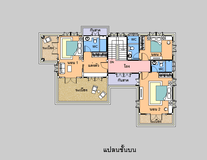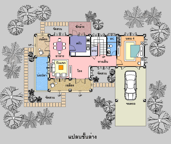 บ้านสไตล์ Modern Thai แบบบ้านอยู่สบาย ใกล้ชิดธรรมชาติ เน้นการประหยัดพลังงาน เป็นบ้าน 2 ชั้น ใช้เป็นบ้านพักอาศัยในเมือง, เป็นบ้านพักตากอากาศ, เรือนริมน้ำ หรือเรือนรับรองได้ มี 4 ห้องนอน 4 ห้องน้ำ ที่จอดรถ 1 คัน รูปทรงภายนอกสวยงาม ทางเข้าบ้าน มีเฉลียงนั่งเล่น นอกชานขนาดใหญ่ ภายในมีส่วนรับแขกโปร่งโล่ง ต่อเนื่องกับ ส่วนทานอาหาร มีเฉลียงออกด้านข้าง ห้องครัว แยกเป็นสัดส่วน และส่วนซักล้างด้านหลัง มีห้องนอนสำหรับผู้สูงอายุ และห้องน้ำ ชั้นบนมีห้องนอนใหญ่ พร้อมส่วนแต่งตัว Walk-in Closet พร้อมห้องน้ำในตัว มีระเบียงส่วนตัวขนาดใหญ่ด้านหน้า และระเบียงเล็กด้านข้าง และห้องนอนขนาดกลางอีก 2 ห้อง พร้อมห้องน้ำในตัว และระเบียงหน้าห้อนอน 2 ชั้นล่าง ** พื้นที่ใช้สอย 125 ตร.ม.** ชั้นบน ** พื้นที่ใช้สอย 120 ตร.ม.**