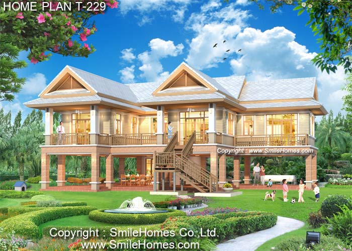 บ้านสไตล์ Modern Thai แบบบ้านอยู่สบาย ใกล้ชิดธรรมชาติ เน้นการประหยัดพลังงาน เป็นบ้านยกพื้นสูง มีใต้ถนชั้นล่าง : บ้าน 2 ชั้น มี 3 ห้องนอน 5 ห้องน้ำ รูปทรงภายนอกสวยงาม โดดเด่นด้วยทรงหลังคา ตัวบ้านตกแต่งผิวผนังด้วยไม้ฝา Shera ชั้นล่างเป็นใต้ถุนโล่ง สามารถวางเป็นส่วนนั่งเล่น ทานอาหาร ส่วนทำงานได้ ด้านหลังทำเป็นส่วนครัวไทย แบบเปิดโล่ง มีหลังคาคลม มีบันไดด้านในขึ้นชั้นบน มีเฉลียงนั่งเล่นนอกชาน ขนาดใหญ่ ภายในมีส่วนรับแขกโปร่งโล่ง ต่อเนื่องกับ ส่วนทานอาหาร มีส่วนเตรียมอาหาร Pantry มีห้องนอนขนาดใหญ่ พร้อมห้องน้ำในตัว 3 ห้อง ห้องนอน 1 และ 2 มีระเบียงใหญ่ส่วนตัวด้านหน้า และห้องน้ำส่วนกลางภายนอก ที่สามารถปรับเป็นห้องพระ หรือห้องเก็บของได้ ชั้นล่าง ** ส่วนใต้ถุนชั้นล่าง สามารถกั้นห้อง ทำเป็นห้องรับแขก, ห้องอาหาร, ห้องนอนเพิ่มได้ และสามารถทำเป็นที่จอดรถใต้อาคารได้** ชั้นบน