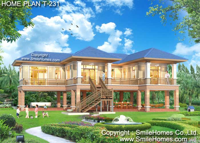 บ้านสไตล์ Modern Thai แบบบ้านอยู่สบาย ใกล้ชิดธรรมชาติ เน้นการประหยัดพลังงาน เป็นบ้านยกพื้นสูง มีใต้ถนชั้นล่าง : บ้าน 2 ชั้น มี 3 ห้องนอน 4 ห้องน้ำ รูปทรงภายนอกสวยงาม เน้นทางเข้าบ้าน ด้วยบันไดทางขึ้นชั้นบนด้านหน้า ตัวบ้านตกแต่งผิวผนังด้วยไม้ฝา Shera ชั้นล่างเป็นใต้ถุนโล่ง สามารถวางเป็นส่วนนั่งเล่น ทานอาหาร ส่วนทำงานได้ ด้านหลังทำเป็นส่วนครั้ว และซักล้าง มีบันไดขึ้นชั้นบน เป็นเฉลียงนั่งเล่นนอกชาน ขนาดใหญ่ ภายในมีส่วนรับแขกโปร่งโล่ง ต่อเนื่องกับ ส่วนทานอาหาร มีส่วนเตรียมอาหาร Pantry และส่วนซักล้างด้านหลัง มีห้องนอนใหญ่ ที่กว้างขวาง พร้อมห้องน้ำในตัว พร้อมระเบียงใหญ่ส่วนตัวด้านหน้า มีห้องนอน 2 พร้อมห้องน้ำในตัว และเฉลียงยาวส่วนตัวด้านหน้า มีห้องนอน 3 และห้องน้ำส่วนกลางภายนอกใช้ร่วมกับห้องนอน 3 ชั้นล่าง ** ส่วนใต้ถุนชั้นล่าง สามารถกั้นห้อง ทำเป็นห้องรับแขก, ห้องอาหาร, ห้องนอน หรือทำห้องน้ำเพิ่มได้ และสามารถทำเป็นที่จอดรถใต้อาคารได้** ชั้นบน