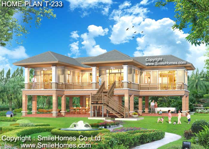 บ้านสไตล์ Modern Thai แบบบ้านอยู่สบาย ใกล้ชิดธรรมชาติ เน้นการประหยัดพลังงาน เป็นบ้านยกพื้นสูง มีใต้ถนชั้นล่าง : บ้าน 2 ชั้น มี 3 ห้องนอน 5 ห้องน้ำ รูปทรงภายนอกสวยงาม เน้นทางเข้าบ้าน ด้วยบันไดทางขึ้นชั้นบนด้านหน้า ตัวบ้านตกแต่งผิวผนังด้วยไม้ฝา Shera ชั้นล่างเป็นใต้ถุนโล่ง สามารถวางเป็นส่วนนั่งเล่น ทานอาหาร ส่วนทำงานได้ ด้านหลังทำเป็นส่วนครัวไทย แบบเปิดโล่ง มีหลังคาคลม มีบันไดด้านในขึ้นชั้นบน มีเฉลียงนั่งเล่นนอกชาน ขนาดใหญ่ ภายในมีส่วนรับแขกโปร่งโล่ง ต่อเนื่องกับ ส่วนทานอาหาร มีส่วนเตรียมอาหาร Pantry มีห้องนอนขนาดใหญ่ พร้อมห้องน้ำในตัว 3 ห้อง ห้องนอน 1 และ 2 มีระเบียงใหญ่ส่วนตัวด้านหน้า และห้องน้ำส่วนกลางภายนอก ที่สามารถปรับเป็นห้องพระ หรือห้องเก็บของได้ ชั้นล่าง ** ส่วนใต้ถุนชั้นล่าง สามารถกั้นห้อง ทำเป็นห้องรับแขก, ห้องอาหาร, ห้องนอนเพิ่มได้ และสามารถทำเป็นที่จอดรถใต้อาคารได้** ชั้นบน