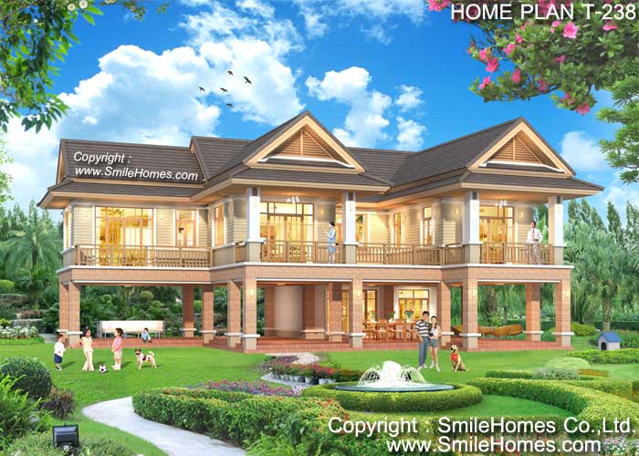 บ้านสไตล์ Modern Thai แบบบ้านอยู่สบาย ใกล้ชิดธรรมชาติ เน้นการประหยัดพลังงาน เป็นบ้านยกพื้นสูง มีใต้ถนชั้นล่าง : บ้าน 2 ชั้น มี 4 ห้องนอน 4 ห้องน้ำ รูปทรงภายนอกสวยงาม โดดเด่นด้วยทรงหลังคาแบบไทยประยุกต์ 2 ชั้น ตัวบ้านตกแต่งผิวผนังด้วยไม้ฝา Shera ชั้นล่างเป็นใต้ถุนโล่ง สามารถวางเป็นส่วนนั่งเล่น ทานอาหาร หรือส่วนทำงานได้ ภายในมีห้องโถงบันได ห้องเก็บของ และห้องนอนสำหรับผู้สูงอายุ หร้อมห้องน้ำส่วนตัว ด้านหลังมีส่วนเตรียมอาหาร และห้องครัวไทยแบบเปิดโล่ง มีบันไดด้านในขึ้นชั้นบน มีเฉลียงนั่งเล่นนอกชาน ขนาดใหญ่ ภายในมีส่วนโถงนั่งเล่น และทานอาหาร ขนาดใหญ่ โปร่งโล่ง มีห้องนอนขนาดใหญ่ พร้อมส่วนแต่งตัวแบบ Walk-In Closet ขนาดใหญ่ แยกส่วน ชาย-หญิง พร้อมห้องน้ำในตัวขนาดใหญ่ ที่มีสุขภัณฑ์ครบชุด และห้องนอนขนาดกลางอีก 1 ห้อง พร้อมห้องน้ำ มีระเบียง่ส่วนตัวด้านหน้า และห้องนอน ขนาดกลางอีก 1 ห้อง และห้องน้ำส่วนกลางภายนอก ชั้นล่าง ** ส่วนใต้ถุนชั้นล่าง สามารถกั้นห้อง ทำเป็นห้องทำงาน, ห้องอาหาร, ห้องนอนเพิ่มได้ และสามารถทำเป็นที่จอดรถใต้อาคารได้** ชั้นบน