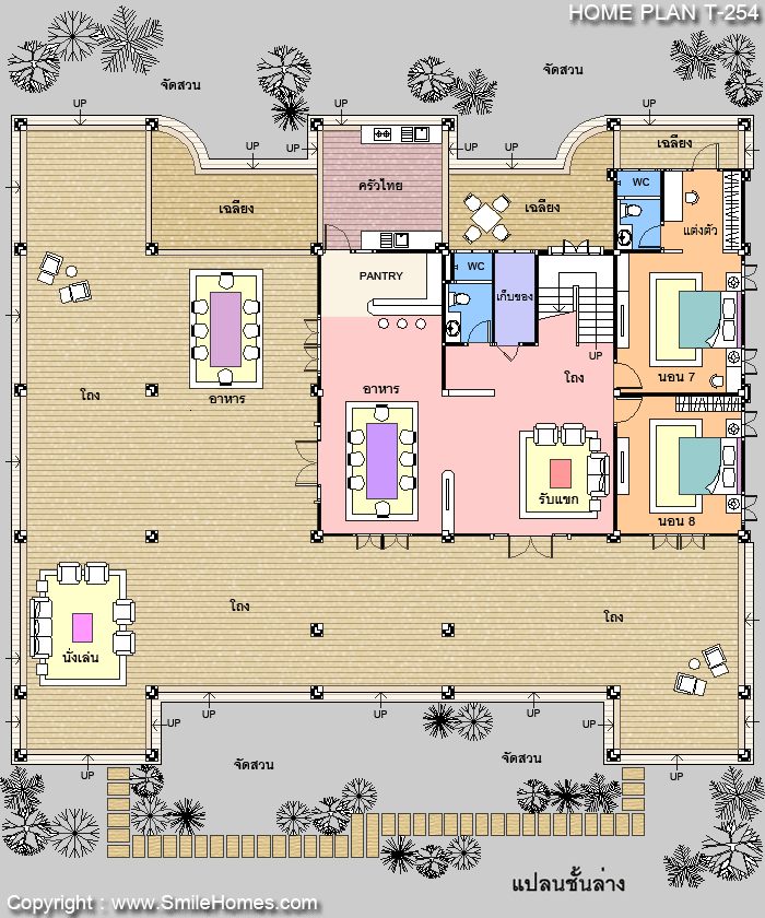 บ้านสไตล์ Modern Thai แบบบ้านอยู่สบาย ใกล้ชิดธรรมชาติ เน้นการประหยัดพลังงาน เป็นบ้านยกพื้นสูง มีใต้ถนชั้นล่าง : บ้าน 2 ชั้น มี 8 ห้องนอน 9 ห้องน้ำ รูปทรงภายนอกสวยงาม สไตล์ไทยประยุกต์ ตัวบ้านตกแต่งผิวผนังด้วยไม้ฝา Shera ชั้นล่างเป็นใต้ถุนโล่ง สามารถวางเป็นส่วนนั่งเล่น ทานอาหาร ส่วนทำงานได้ ส่วนห้องภายในมี ห้องรับแขก ห้องอาหาร ห้องนอนผู้สูงอายุ พร้อมห้องน้ำในตัว และห้องนอนสำหรับแขก มีส่วนเตรียมอาหาร Pantry และส่วนครัวไทย ห้องเก็บของ ชั้นบน มีเฉลียงนั่งเล่นนอกชาน ขนาดใหญ่ ภายในมีส่วนรับแขกโปร่งโล่ง ต่อเนื่องกับ ส่วนทานอาหาร และห้องนั่งเล่นขนาดใหญ่ มีห้องนอนขนาดใหญ่ พร้อมส่วนแต่งตัวแบบ Walk-In Closet และห้องน้ำในตัว 4 ห้อง และห้องนอนขนาดกลาง หร้อมห้องน้ำในตัวอีก 2 ห้อง มีส่วนเตรียมอาหาร Pantry และห้องเก็บของ มีระเบียงใหญ่ด้านหน้า และห้องน้ำส่วนกลาง