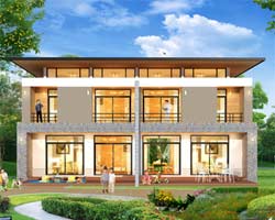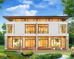แบบบ้านแฝด 2 ชั้น D-222 จำนวน 2 หลัง มี 5 ห้องนอน 4 ห้องน้ำ พื้นที่ใช้สอยต่อหลัง 240 ตร.ม. ที่ดิน 100 ตร.ว. ขึ้นไป |